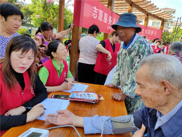 考慮到9月12日天氣炎熱和老年人生活習(xí)慣,志愿者們7點就早早來到陽光社區(qū)市民廣場,穿上紅十字志愿者馬夾,搭帳篷、擺桌椅、調(diào)試檢測儀器。隨著老人的陸續(xù)增多,志愿者們有序引導(dǎo)他們挨個檢查血壓、視力,鹽城倍美口腔醫(yī)務(wù)工作者耐心解答有關(guān)健康問題,講解秋季健康飲食的要點。