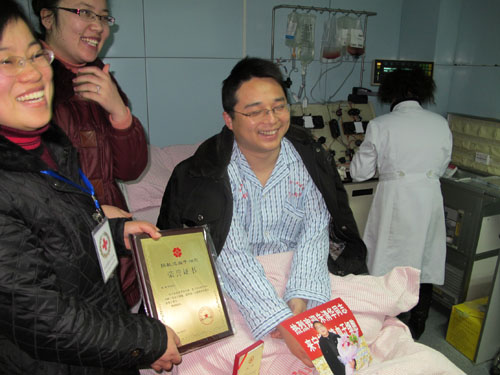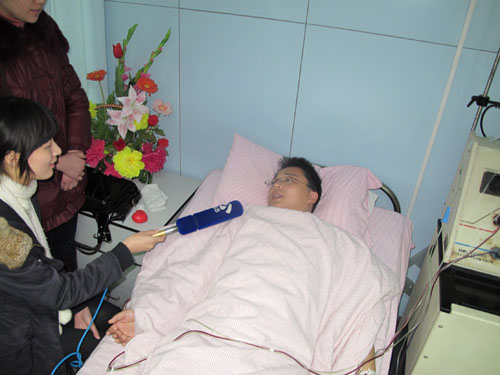 記者采訪正在采集造血干細(xì)胞的朱清華同志