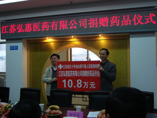 3月22-23日,江蘇弘惠醫(yī)藥有限公司分別在東臺(tái)市、大豐市、阜寧縣舉行藥品捐贈(zèng)儀式,省紅十字會(huì)黨組書記、專職副會(huì)長單加海,鹽城市紅十字會(huì)會(huì)長谷容先、常務(wù)副會(huì)長徐金旸、專職副會(huì)長喬靜等領(lǐng)導(dǎo)參加捐贈(zèng)儀式。此次藥品捐贈(zèng)活動(dòng)共向我市捐贈(zèng)價(jià)值81萬元藥品,主要用于救助困難患者。
