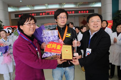 4月28日下午,成功捐獻造血干細胞的陳驥從南京載譽歸來,受到了熱烈歡迎。市紅十字會常務(wù)副會長喬靜、亭湖區(qū)副區(qū)長尹同陽等早早來到鹽城沿海高速出口處迎接剛捐獻完造血干細胞的陳驥回鹽。陳驥是全市第14例、亭湖區(qū)第3例造血干細胞捐獻者。今年35歲的陳驥在鹽城新東仁醫(yī)院當(dāng)保安。2009年5月,他參加所在醫(yī)院組織的造血干細胞血樣采集,成為一名捐獻造血干細胞志愿者。當(dāng)他聽到自己與上海一位12歲的小女孩相配對時,感到萬分驚訝,因為造血干細胞成功配對的幾率很低。他暗暗下定決心,一定要幫助這個小女孩。